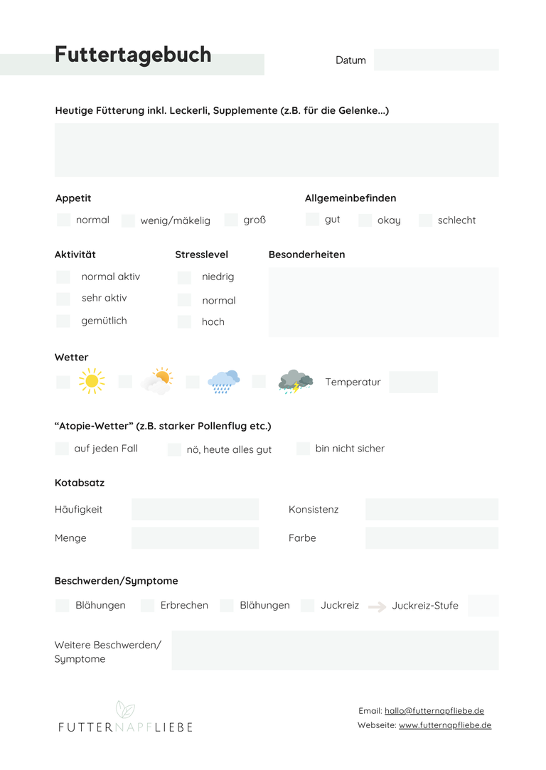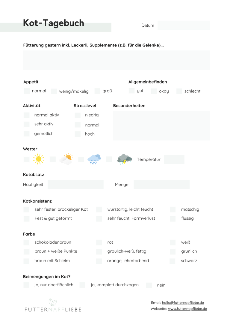 Du hältst Kotbeschaffenheit, Häufigkeit, Besonderheiten und Begleitumstände fest – ein wertvolles Dokument für jede tierärztliche oder ernährungsberaterische Einschätzung.