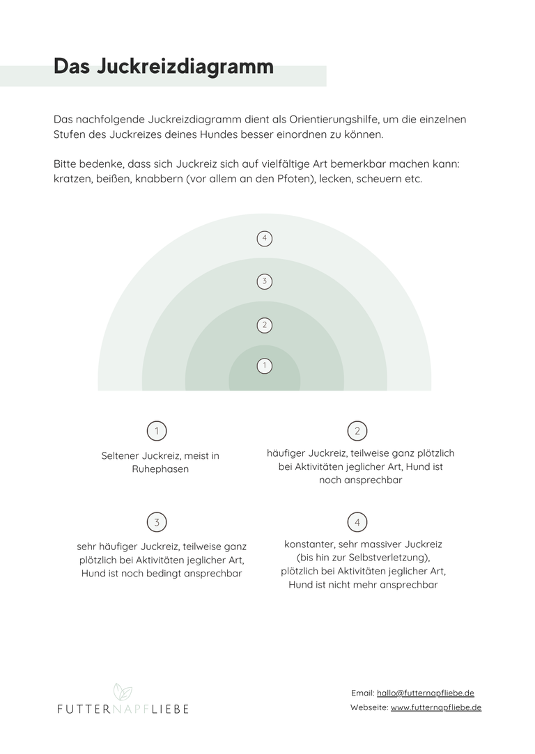 Wenn dein Hund sich viel kratzt, beißt oder leckt, hilft dieses Diagramm dir, Muster zu erkennen: wann, wo, wie stark, in welchen Situationen.